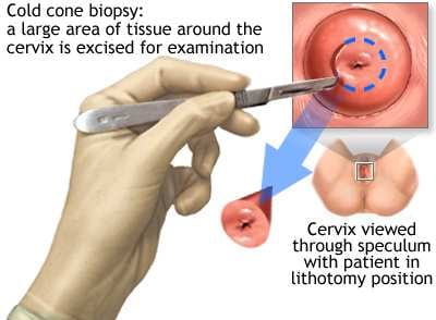 A cone biopsy is the procedure in which a cone-shaped portion of tissue is taken from the cervix. This is done in the operating theatre, usually under general anaesthesia.
